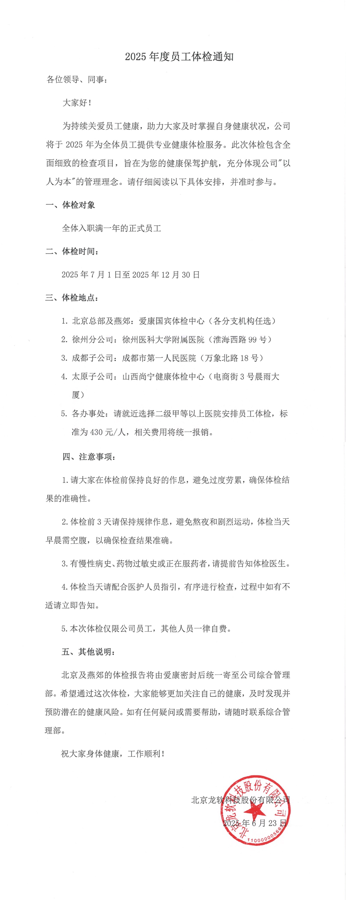 2025年度员工体检通知