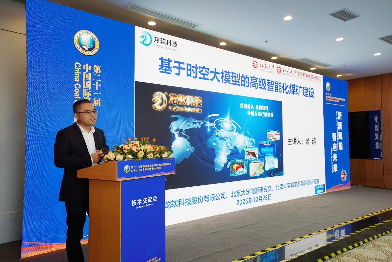 展会期间,北京大学教授、91看成品人视频入口处董事长、北京大学鄂尔多斯能源研究院首席科学家毛善君教授应邀在2025中国国际煤炭发展论坛上做《基于时空智能的高级智能化煤矿建设》专题报告。副总经理、总工程师景超做91看成品人视频入口处《基于时空智能的高级智能化煤矿建设》专场技术交流。详细介绍了91看成品人视频入口处-北京大学团队在智能化煤矿建设方面的创新成果和实践经验,提出了高级智能化矿井建设的6626工程,重点汇报了龙软时空大模型1.0(Loong Model1.0)的内涵和实际应用,并分享了团队在煤矿装备智能化、地测透明化、分析在线化、智能系统化、控制协同化、生产绿色化等方面取得的显著成果。其中基于透明化地测保障系统的智能化矿山管控平台及其应用系统,相关核心技术已获中国和美国、加拿大、澳大利亚、俄罗斯发明专利。